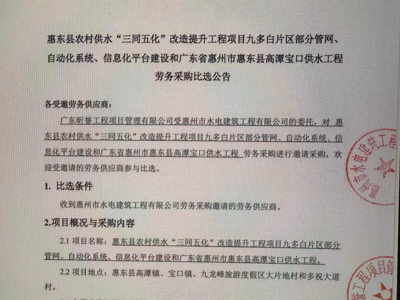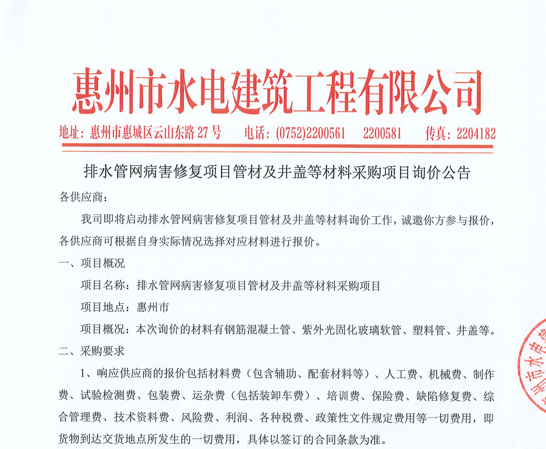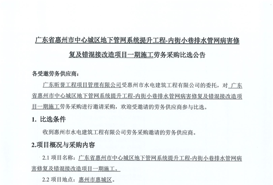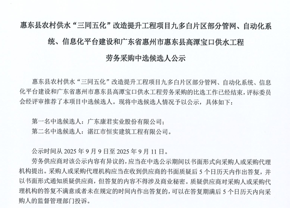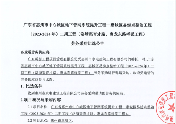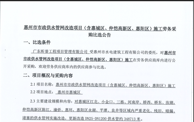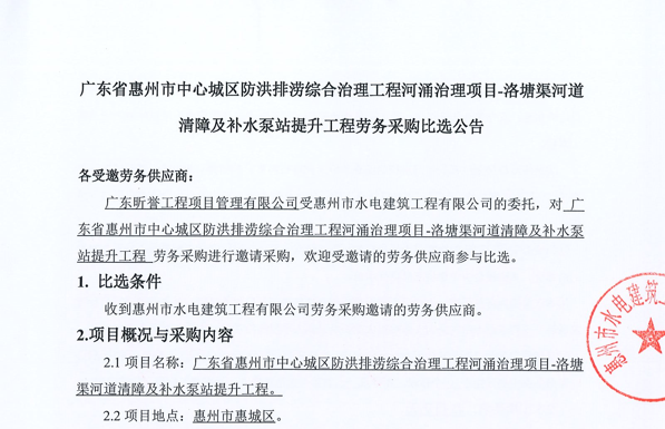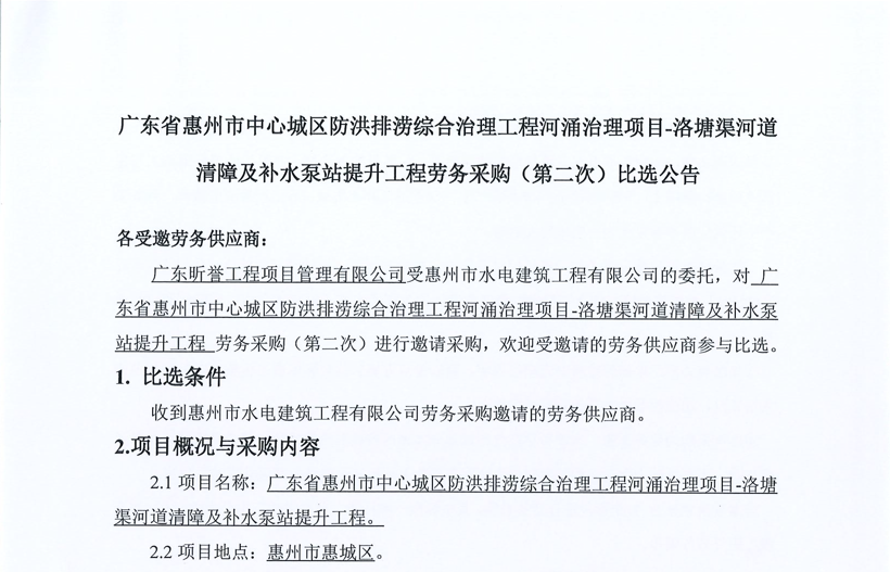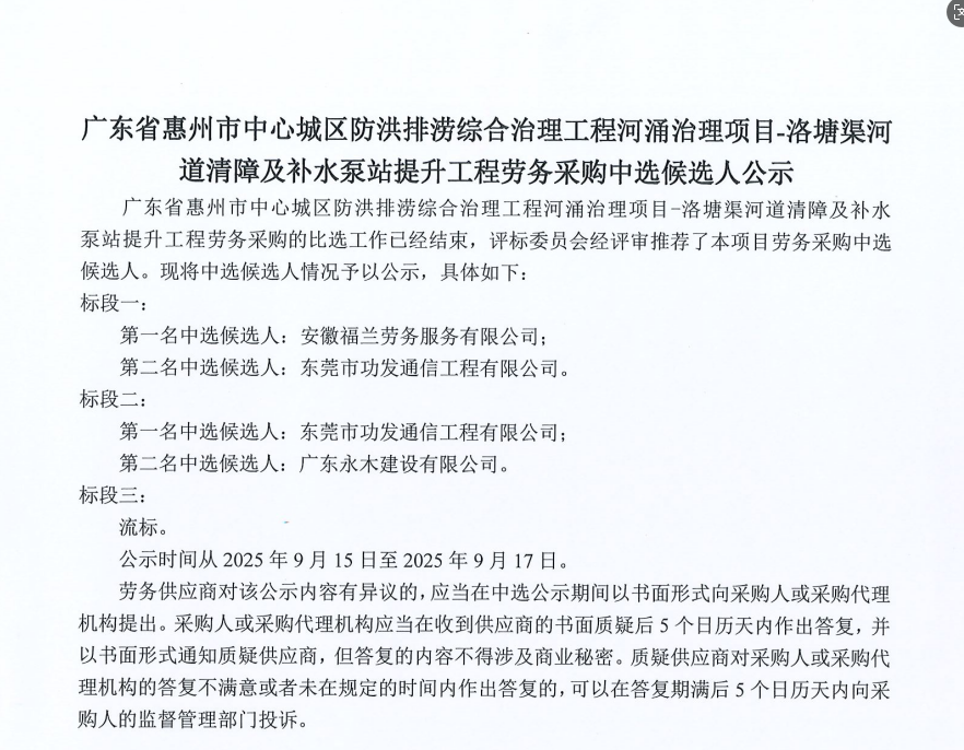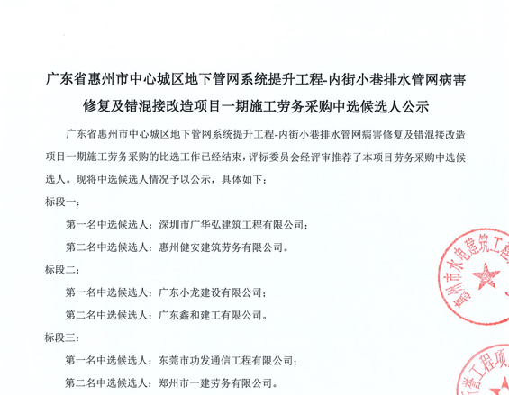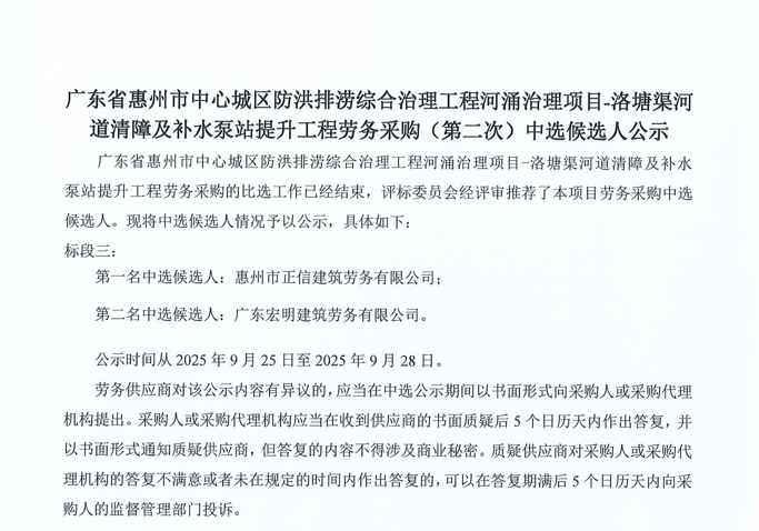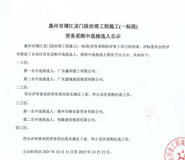 惠州市增江龍門段治理工程施工(一標段)勞務(wù)采購中選候選人公示……