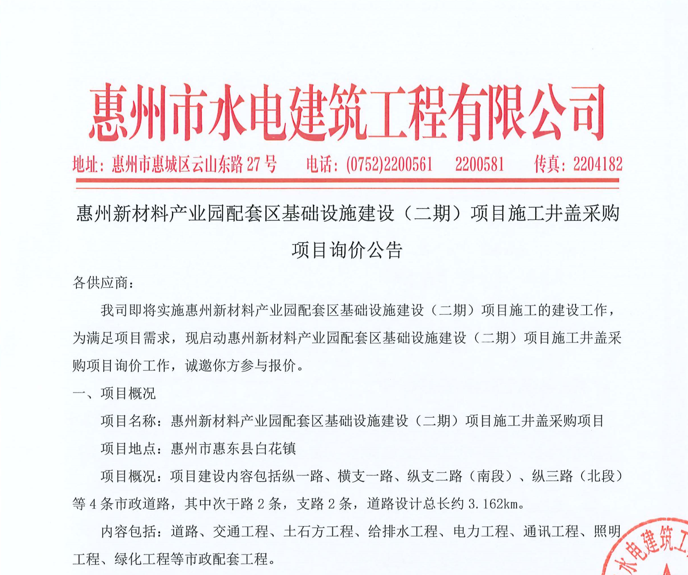 惠州市水電建筑工程有限公司成立于一九六四年四月,隸屬惠州市水務(wù)集團有限公司,是一家國有綜合性施工企業(yè),主營水利水電工程、房屋建筑、市政工程等施工業(yè)務(wù)。公司擁有水利水電工程施工總承包一級、建筑工程施工總承包一級、市政公用工程施工總承包一級、公路工程施工總承包三級,公路路基、路面及建筑裝修裝飾專業(yè)承包二級,環(huán)保工程、機電安裝、河湖整治、輸變電工程專業(yè)承包三級等經(jīng)營資質(zhì)……